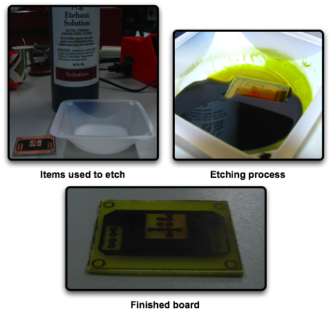 The above image show the process of etching away the copper that is not protected by the toner. We used a large weigh dish to put the board and etchant in making sure that the copper side is facing down. Once the board hits the chemical, you will want to agitate it till the process is done, about 20 minutes. Agitating the system speeds up the kinetics which in turn helps you by not letting the board soak so long that the chemical eats away the copper under the toner. The second picture shows the process almost completed and the third shows the board completed.