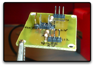 Once the resistors are in place, the next item to be installed is the right angle headers. Break off two individual headers from the break away row. The reason why we used right angle headers is to differentiate them from the rest of the connectors as being power and ground connections. This ensures that you don't put power to the wrong pin.