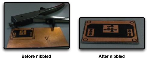 Once you are finished with the artwork and filling in any spots missed with the Sharpie, it's time to remove only the portion of the copper clad proto-board that we need. We used what is called a nibbler to basically "nibble" out the circuit board from the copper.