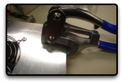 Again, use the Dremel and files to make a hole large enough so that the fan sucks in air to the enclosure. We used one of the sides of the box for this. Also, make holes in the sheet metal so that you can fit screws through it (a clearance hole) and the guard to tap into the fan. Since we used an old computer fan, the screws were already available. However, if you need screws, you can use these which are #10 screws. Do make sure that this is the proper size screw for the fan you purchased if it does not come with screws. They are self tapping so that they tap into the fan. This is why the holes made in the side of the enclosure are clearance holes. The easiest way to do this is to use the hand punch. However, if you do not have a hand punch, just drill the holes in the sheet metal.