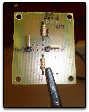 After you have all your holes drilled you can start inserting the components to the board. As a general rule of thumb, you will want to solder items that are the shortest first. In our case, the shortest items are the resistors so we shall start with those. Look at the blow up diagram of the circuit to ensure that you put the resistors in the correct spot.