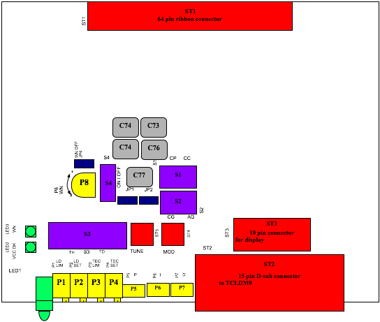 The above figure is a blow up of the figure given in the manual that shows the placements of the various switches, jumpers, connectors and potentiometers on the ITC133. You will need to adjust the switches dependent upon what type of diode you purchased. Below is a description of each adjustable component on the board.