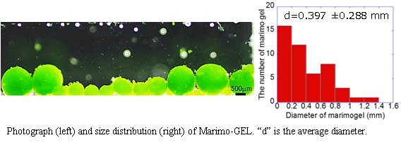 From the photograph and histogram, it is evident that Marimo-GEL of large size (>300 µm diameter) could be prepared, which not small enough by introducing into the flow cell.
