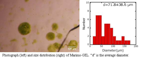 From the photograph and histogram, it is evident that Marimo-GEL of very small size (<100 µm diameter) could be prepared, which small enough by introducing into the flow cell.