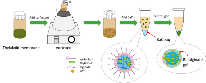 0.2 g/mL ER290 surfactant in paraffin oil 1000 µL was added on the mixture of 2 wt % alginate 100 µL and 2.1 mg/mL thylakoid membrane 100 µL in the brown bottle. The brown bottle was vortexed to form micell which was composed of the mixture of alginate and thylakoid membrane. The micell in the dispersion liquid was added on the 50 mM BaCl2 solution in a microcentrifuge tube. When the tube was centrifuged, Marimo-GEL was formed due to cross-link between alginate and Ba2+ ions.