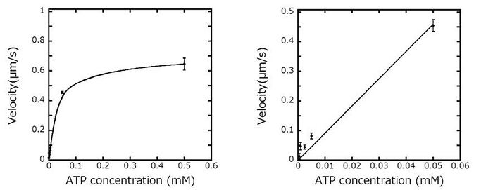 Dependence of velocity of microtubules on the concentration of ATP (left) and initial part of the graph (right).