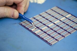 Conventional "Pick and Place" (PNP) assembly is often seen in the assembly of electronic parts through robotic assistance. [5] PNP assembly is exactly how it sounds: premade components are placed in predetermined ways to increase manufacturing efficiency. [5] PNP machines are often employed to assemble many devices at once. The PNP assembly method is very similar to conveyer belt manufacturing at a large factory. Many PNP machines have vacuum-assisted parts that are used to "pick" specific components and "place" them in their correct space and orientation. [5] PNP assembly is much more efficient compared to simple modular assembly, as it automates an existing assembly process into a much faster and more efficient one. PDMS can also be used in PNP assembly for especially fragile component parts with their adhesive and elastomeric properties. [6]
