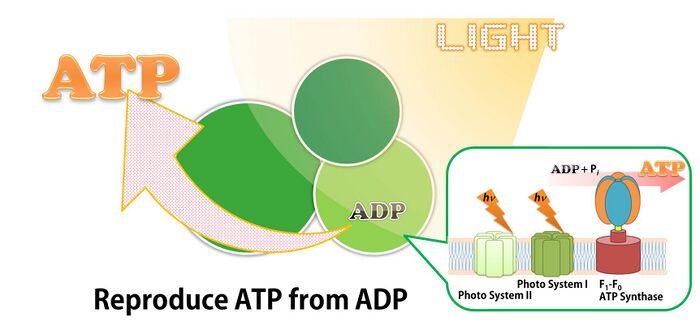 Microtubules are driven by kinesin utilizing the energy from hydrolysis of ATP. On the other hand, some biomolecular motor can produce ATP. For example, thylakoid membrane inside chloroplasts included in spinach convert ADP to ATP. We would like to establish a system that can use the ADP to reproduce ATP, which allow microtubules to continue moving. We synthesized micro sized green gels including thylakoid membrane from spinach, which can reproduce ATP from ADP by using the energy from light. This gel is termed as Marimo-gel.