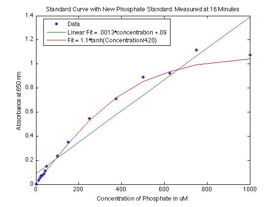 From previous standard curves I noticed that there is a curvature that is pretty poorly estimated by a linear fit. I thought that it looked a bit like a hyperbolic tangent functions, so I played around with graphing the hyperbolic tangent function with various coefficients of the concentrations. I found the curve that best fit this specific data was