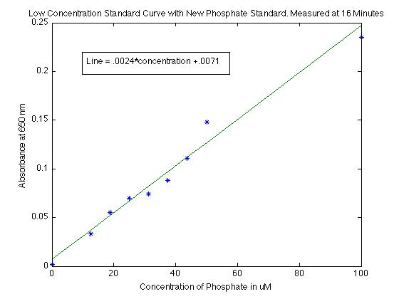 As I mentioned though, I will in the future be dealing with low concentrations of phosphate, probably between 0 to 100 uM. I made several measurements for lower concentrations so that the measurements are clearer. I did find that for low concentrations (less than 100 uM) the absorption is pretty linear fit by