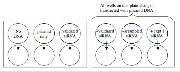 2. All the lipofections will be done in duplicate with 20 ng of DNA/well and/or 10 pmoles of siRNA/well. Prepare a cocktail with enough material to perform both replicates. The following table may be helpful for your calculations.