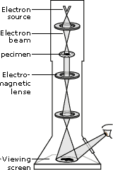 The Transmission Electron Microscope (TEM) achieves its remarkable resolution by “illuminating” samples using an electron beam in a vacuum rather than using a conventional light source in air. Since the electron beam passes through the sample that is being examined, the sample must be sufficiently thin and sufficiently sturdy to be hit by electrons in a vacuum. It’s important to remember that many biological materials are damaged or destroyed by the incoming electrons and that the TEM can image only the species that survive this harsh treatment. The denser parts of the sample will absorb or scatter some of the electron beam, and it’s the scattered electrons or those that pass through the sample that are focused using an electromagnetic lens. This “electron shadow” then strikes a fluorescent screen, giving rise to an image that varies in darkness according to the sample's density. For samples that are amenable to TEM, this form of examination can allow observation of angstrom-sized objects and of cellular details down to near atomic levels.