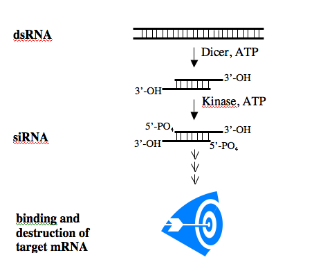 The biochemistry of the RNAi pathway is relatively well characterized and the general features of siRNAs are known. To induce RNAi, a dsRNA is processed within the cell to an siRNA which then binds to its single-stranded mRNA target. The binding leads to the destruction of the mRNA, effectively silencing gene expression.