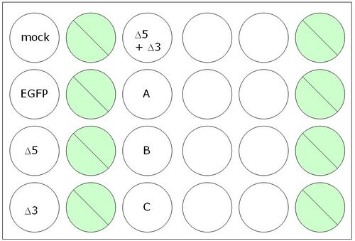 - 3. For the lipofections to be done in triplicate, you’ll need a total of 150 ul of DNA diluted in OptiMEM. By making one lipofection cocktail that is later divided between replicates, you can be confident that each replicate was treated identically. The basic protocol is to do a lipofection with 0.1 ug of ∆5 and 0.1 ug of ∆3.