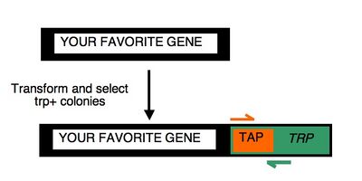 This is accomplished by using a forward primer that anneals to the very 5'-end of the TAP gene you've tried to add to your gene of interest and a reverse primer that anneals to a very 3'-end of the TRP gene that was part of the TAP tag and used for selection. There are two important caveats about today's experiment. First, if the TAP tag is fused elsewhere in the genome (giving rise to the trp+ phenotype) but the SAGA- or SAGA-controlled gene remains intact, then you may still see a product from this reaction. Thus we'll have to follow up in other ways to confirm that the gene of interest has, in fact, been modified. Second, you should be aware that a negative result from these reactions (i.e. no PCR product) can just as easily be explained as a failed PCR (bad primers, dead enzyme, wrong reaction conditions, etc) as a failed tagging transformation. So don't let a negative result today fool you and lead you to toss out perfectly correct samples. Only the positive result is meaningful in this experiment and we will not know the result until you run the agarose gel next time. So, we will remain optimistic and set up overnight cultures of both the candidates you are examining today. In this way you will have cells to examine next time, when you will check them for the TAP-tag by Western blot and when you will isolate total RNA from them for microarray analysis.