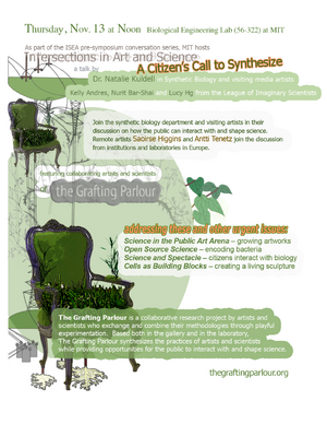 - if you are inclined to pursue the collaborative science and art project for display, please begin by researching other genetically programmed works that the public has seen. Ideally these would be interactive exhibits with biology or biotechnology. As a starting point, consider artists like Kac and the League of Imaginary Scientists who have done some great work in this area. You should hand in an image and some descriptive text for 3-5 exhibits that either piqued your interest or that didn't work for you at all. Come to lab prepared to describe them for and discuss them with your partner. The artists will be in the lab to work with us on Nov 13th from noon to 1PM and the conversation will be part of an exhibit in Dublin. The outline for that conversation is here