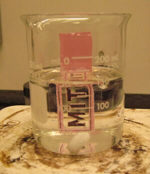 One of the teaching faculty will place your slide, pattern down, into the acid wash solution that is gently mixing on a stir plate in the hood. Balance your slide on the edge of the beaker, so the red tape remains outside the acidic solution. It should be possible to balance 3 or 4 slides in each beaker.