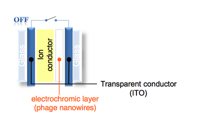 Today you’ll peel away portions of a slide’s surface coat so that next time you can add phage nanowires to the places where the coat remains. The slide’s coats are ITO (“indium tin oxide”), which is a transparent conductive material. Eventually, the ITO will serve as the electrodes of our phage-based electrochromic device. A preview the device architecture is shown below.