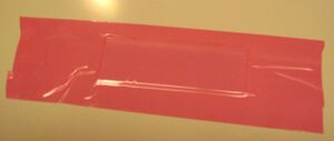 Peel off the paper, scotch-tape and red tape to expose the areas of the slide where the ITO is to be removed (i.e. where no phage will bind, i.e. where no color will form). The silver tweezers in your drawer should be useful for this step. Use the Exact-O knife as needed also.