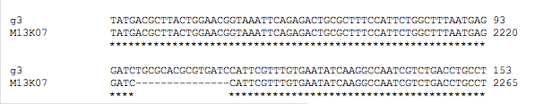 Rather than look through the sequence to magically find the relevant portion, you can align the data you just got with the standard M13K07 sequence and the differences will be quickly identified. There are several web-based programs for aligning sequences and still more programs that can be purchased. The steps for using two web-based tools are sketched here. You do not have to perform your alignments using both programs (the results ought to be the same!!). They are both provided here for your reference.