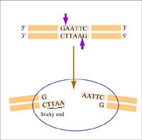 Unlike EcoRI, some other restriction enzymes cut precisely in the middle of the palindromic DNA sequence, thus leaving no overhangs after digestion. The single-stranded overhangs resulting from DNA digestion by enzymes such as EcoRI are called sticky ends, while double-stranded ends resulting from digestion by enzymes such as HaeIII are called blunt ends. HaeIII recognizes