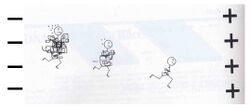 Electrophoresis is a technique that separates large molecules by size using an applied electrical field and a sieving matrix. DNA, RNA and proteins are the molecules most often studied with this technique; agarose and acrylamide gels are the two most common sieves. The molecules to be separated enter the matrix through a well at one end and are pulled through the matrix when a current is applied across it. The larger molecules get entwined in the matrix and retarded; the smaller molecules wind through the matrix more easily and travel further from the well. Molecules of the same size and charge migrate the same distance from the well and collect into a band.