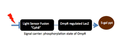 The bacterial photography system we are studying modifies a natural osmolarity signaling pathway in E. coli so that light striking the cell can be converted to a detectable output. The green and orange dumbell-shaped cartoon in the figure (below) represents the input sensor. It's represented as a dumbell since light-sensing requires the combined action of two proteins: a natural light-sensing protein called Cph1 that comes from an algae (shown as the green lobe) and the transmembrane two component signaling protein called EnvZ (shown as the orange lobe). To fully function, the cell must also express phycobilin producing proteins to make accessory pigments needed for the light-sensing fusion protein to work. These phycobillins are shown in the box at the left of the signaling pathway and marked as "PCB" on the green lobe of the fusion protein cartoon. The Cph1:EnvZ fusion, called Cph8 by the authors of the paper, starts a phosphorelay within the cell’s osmoregulation pathway. OmpR is the response regulator and signal carrier, changing the activity of an OmpR regulated promoter that is directing transcription of LacZ. Finally the β-galactosidase enzyme from LacZ works on a chromogenic substance, Sgal, turning the media dark when LacZ transcription is high (i.e. cells are grown in the dark) or precipitating less color in the media when LacZ transcription is low (i.e. cells are grown in the light)