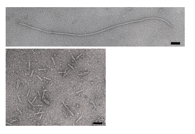 The bacteriophage M13 is a member of the filamentous phage family. It has a long (~900 nm), narrow (~20 nm) protein coat that encases a small (~6.4 kb) single stranded DNA genome. The genome encodes 11 proteins, five of which are exposed on the phage’s protein coat and six of which are involved in phage maturation inside its E. coli host. The phage coat is primarily assembled from a 50 amino acid protein called pVIII (or p8), which is sensibly enough encoded by gene VIII (or g8) in the phage genome. For a wild type M13 particle, it takes about ~2700 copies of p8 to make the ~900 nm long coat. The coat's dimensions are flexible though and the number of p8 copies adjusts to accommodate the size of the single stranded genome it packages. For example, when the phage genome was mutated to reduce its number of DNA bases (from 6.4 kb to 221 bp) [2], then the p8 coat “shrink wraps" around the reduced genome, decreasing the number of p8 copies to less than 100. Electron micrographs of the resulting “microphage” and its wild type parent are shown below (image courtesy of Esther Bullitt, Boston University School of Medicine), where the black bar in each image is 50 nm long. And what about the upper limit to the length of the phage particle? Anecdotally, viable phage seems to top out at approximately twice the natural DNA content. However, deletion of a phage protein (p3) prevents full escape from the host E. coli, and phages that are 10-20X the normal length with several copies of the phage genome can be seen shedding from the E. coli host.