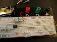 - The second connection is to a wire that runs to a variable resistor (see the "finished circuit"). You will change the current into the OpAmp by varying the resistance through the circuit this point. You will start by putting no resistor in, where air serves as an infinitely large resistor.