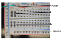- Power the breadboard by running a wire from the +V source (= the red terminal) to the + rail (= the red + connections at the "top" of the breadboard).