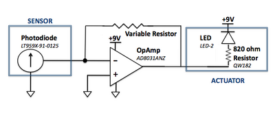 | Photodiode (sensor) | OpAmp (logic) | Resistor (gain) | LED (actuator) |