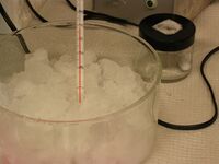 - Prepare a supercooled ice bath by mixing ~400g ice (measured with the top loading balance) with ~133 g NaCl (so ~1 g salt for every 3 g ice). The ice and salt should be placed in an evaporation dish, mixed with a gloved hand the way you might mix chocolate chips into cookie batter. The salt and ice mixture should almost fill the evaporation dish. You can measure the temperature of this mixture. It should measure ~ negative 20°C.