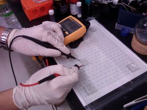 - Use a resistance meter to determine which side of a prepared glass anode base contains the layer of TiO2 coated FTO. The coated side of interest should have a measurable level of resistance while the pure glass side should not.