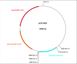 - In the pCX-NNX file, find the restriction enzymes for cloning, and cut away the sequence in between.