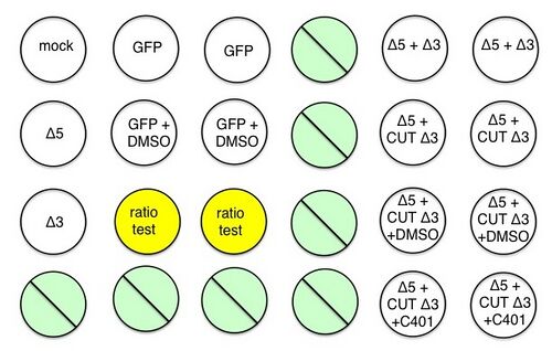 Please adhere to the schematic exactly, as some wells have been pre-treated with inhibitor C401 or its carrier solvent DMSO (as a control). The two wells marked in yellow are your opportunity to test a specific hypothesis related to template and donor DNA availability.