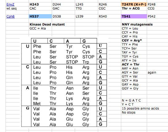 A map of the plasmid that encodes the light-sensor protein, Cph8, is shown. To make the library that we used last time, the plasmid was modified with a degenerate oligonucleotide. The degenerate oligo was synthesized with a mixture of nucleotides at the K+P- relevant position T541, as shown below. PCR was used to extend the degenerate oligos to incorporate them into the pCph8 backbone. Thus PCR products are a mixture of different sequences since the initial oligo template that was PCR amplified had a variety of sequences. Fifteen possible amino acids could be encoded at T541 if the oligo is responsible for the changes we see. It's important to remember that PCR itself has a low but detectable error rate, raising the possibility that mutations outside of the K+P- hotspot could lead to the phenotype you screened through. It's also possible that the plasmid itself is not responsible for the phenotype but rather there has been some random change in the cell's genome or in the pPCB plasmid that is responsible. As a class, though, we'll hope that there are enough interesting mutations to consider and learn from.