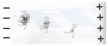 DNA and RNA are negatively charged molecules due to their phosphate backbone, and they naturally travel toward the positive charge at the far end of the gel. They are typically examined with agarose gels. Proteins are composed of amino acids that can be positively, negatively, or uncharged. To give proteins a uniformly negative charge, they are coated with a detergent, SDS, prior to running them on a gel. Protein samples are also boiled to remove any secondary structure that might make two molecules of the same size migrate differently. Polyacrylamide is the matrix commonly used to separate proteins. These gels are typically run vertically while agarose gels are run horizontally but gravity has nothing to do with the separation.
