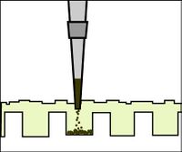 - To load your samples, draw the volume listed on the table below into the tip of your P200. Lower the tip below the surface of the buffer and directly over the well. You risk puncturing the bottom of the well if you lower the tip too far into the well itself (puncturing well = bad!). Expel your sample into the well. Do not release the pipet plunger until after you have removed the tip from the gel box (or you'll draw your sample back into the tip!).