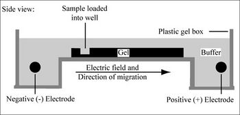 Electrophoresis is a technique that separates large molecules by size using an applied electrical field and a sieving matrix. DNA, RNA and proteins are the molecules most often studied with this technique; agarose and acrylamide gels are the two most common sieves. The molecules to be separated enter the matrix through a well at one end and are pulled through the matrix when a current is applied across it. The larger molecules get entwined in the matrix and are stalled; the smaller molecules wind through the matrix more easily and travel further from the well. Molecules of the same size and charge migrate the same distance from the well and collect into a band.