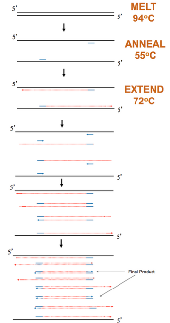 In addition to the target, PCR requires only three components: primers to bind sequences flanking the target, dNTPs to polymerize, and a heat-stable polymerase to carry out the synthesis reaction over and over and over. PCR is a three-step process (denature, anneal, extend) and these steps are repeated 20 or more times. After 30 cycles of PCR, there could be as many as a billion copies of the original target sequence.