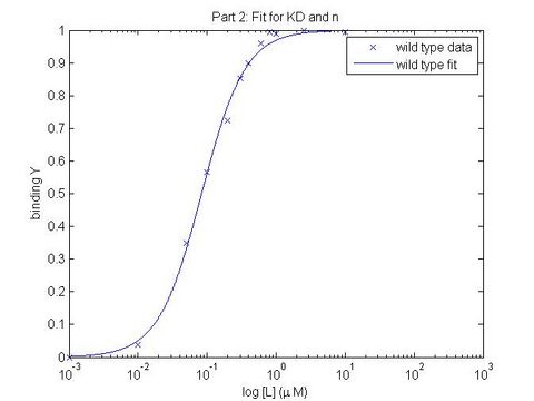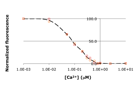 In this experiment, you will modify a protein called inverse pericam (developed by Nagai et al.) in order to affect its function. Inverse pericam (IPC) comprises a permuted fluorescent protein linked to a calcium sensor. The “inverse” in the name refers to the fact that this protein shines brightly in the absence of calcium, but dimly once calcium is added at sufficient concentration. The dissociation constant [math]\displaystyle{ K_D }[/math] of wild-type IPC with respect to calcium is reported to be 0.2 μM (see also figure below). Your goal will be to alter the binding curve by mutating a single residue in IPC. You will modify inverse pericam at the gene level using a process called site-directed mutagenesis, express the resultant protein in a bacterial host, and finally purify your mutant protein and assay its calcium-binding activity via fluorescence. You may find that you shift the titration curve, which corresponds to altering [math]\displaystyle{ K_D }[/math]; or you might change its steepness, which corresponds to changing cooperativity (and thus concentration dynamic range); finally, you might affect the maximum and/or minimum fluorescence values, thus changing the sensor's signal:noise profile (fluorescence dynamic range). You might even obliterate the response to calcium entirely! In the course of this module, we will consider the benefits and drawbacks of different approaches to protein design, and the types of scientific investigations and applications enabled by fluorescently tagged biological molecules.