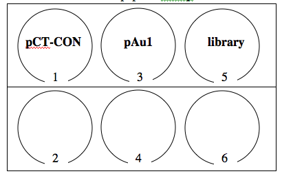 Some of the work for this experiment has already been done for you. Two nights ago, the yeast strains needed for today were grown to saturation in glucose-containing media at 30°C. A lack of tryptophan in that media insures that all the yeast carry the pCT-CON, pAu1 or library plasmids. Yesterday, an aliquot of the cells was moved to fresh media (“subcultured”). This time galactose containing media was used to induce display of the fusions. The cells on your bench have been grown at room temperature for at least 20 hours.
