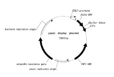 The yeast express the Aga2:HA:scFv:c-myc fusion from a plasmid called pCT-CON. Other features of this plasmid include