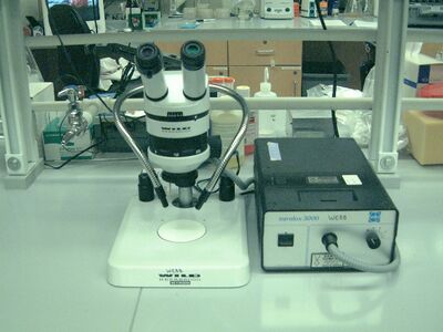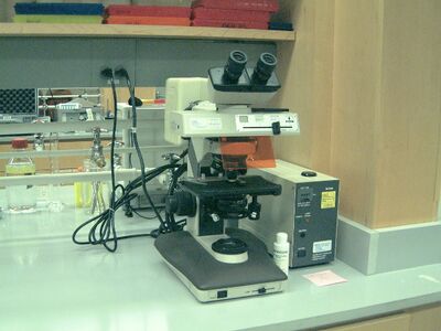 Much of biology examines natural components that are too small to see. Imaging technology took a gigantic step forward in the 1680s when Anton van Leeuwenhoek ground a microscope lens sufficiently fine to see a living cell (a bacteria he had scraped from his teeth!). His microscope had one lens and the image he saw was approximately 250 times its natural size (250X magnification). Compound microscopes, like the ones we have in lab, use a second lens to magnify the image from the first and can increase the total magnification up to 1000X. One of our microscopes is also attached to a beam splitter that allows excitation light to be separated from emitted light. This allows us to perform fluorescence microscopy.