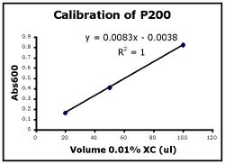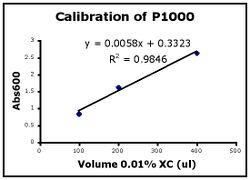 In this assay you will calibrate your pipets by measuring the absorbance of the XC dilutions you made. Beer’s Law, which relates absorbance to concentration, will be derived as part of experimental module 2. Here, you’ll see that the graph of absorbance versus volume of 0.01% XC is a straight line….or at least it should be!
