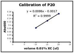 - Using your P20, measure 10, 15 and 20 μl of the 0.01% XC stock solution into the bottom of three cuvettes. Using your P1000, add water to bring the final volume to 1 ml (=1000 μl).