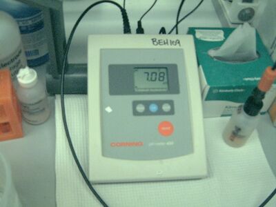 - Remove the pH electrode from the storage solution and rinse it over the waste beaker using distilled water from the wash bottle. A Kimwipe can be used to gently dry the electrode.