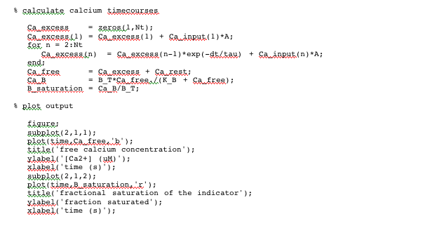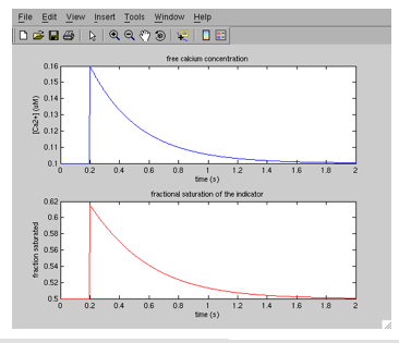 The next section poses some questions you will answer as part of the exercise. Most of the questions will require you to run the m-file after resetting some of the parameters in lines 4-20 of the m-file. Each time you run the m-file, you will generate a new figure showing the trajectory of free calcium concentration (blue, top plot), and the fractional saturation of the calcium indicator (red, bottom plot). If you were doing actual fluorescence experiments, the signal changes you would be recording would be proportional to the fractional saturation of the indicator. In addition to learning about the calcium dynamics by reading the plots, you can learn the calculated values of each model parameter by typing the corresponding variable name at the Matlab command line: