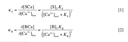 kS and kB are referred to as the “calcium binding ratios” for S and B, respectively. In reality, both kS and kB are calcium-dependent variables, but for purposes of our simplified model, we will approximate them as constants equal to their values at the cell’s resting calcium level, [Ca2+]rest. The dynamics of the system are then governed by the following equation: