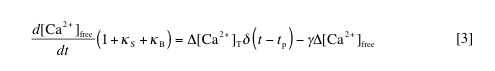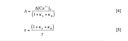 This equation simply states that the change in calcium at any time (left side) is equal to the pulsed increase in calcium at times tp (right side, first term) minus the extrusion of calcium with rate constant g (right side, second term), where delta[Ca2+]free = [Ca2+]free – [Ca2+]rest. By solving this equation, we can determine the amplitude (A) and decay time (t) of the spikes in free and bound calcium caused by each injection. These are given by: